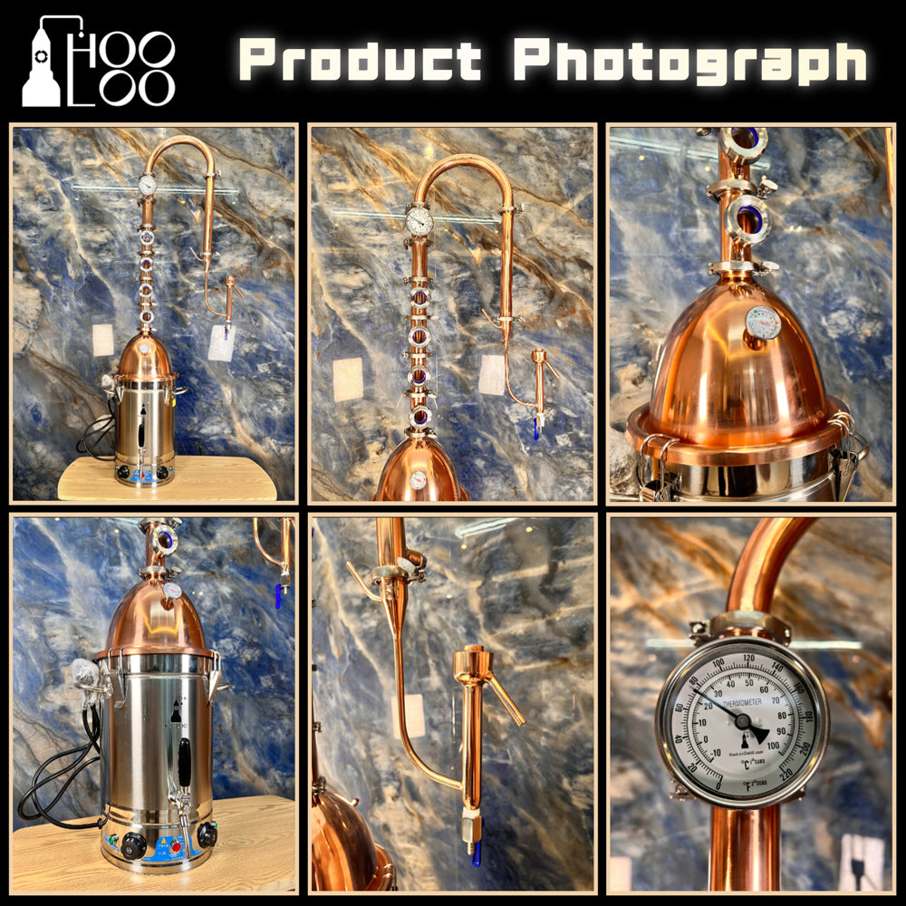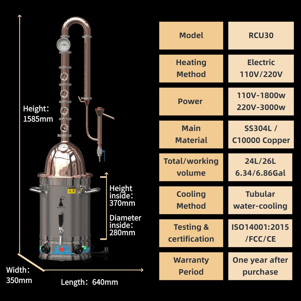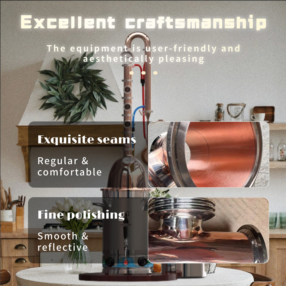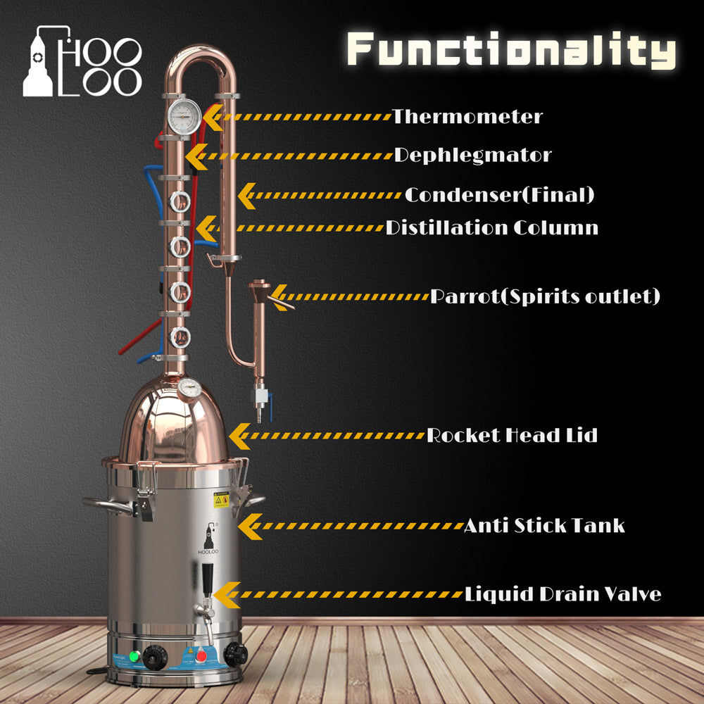 HOOLOO CT30Cu-Destilliergerät, geeignet für den Heimgebrauch und kleine Werkstätten, einzigartige Glasturmstruktur, mehrschichtige Destillation. In sich geschlossene elektrische Heizung wird über einen Knopf gesteuert, reiner Kupferkristall, vollständige Destillation, exquisite Brauausrüstung. Kann für Gin verwendet werden. Herstellung von Whisky, Brandy, Wodka, Rum, Hydrolat und ätherischen Ölen.