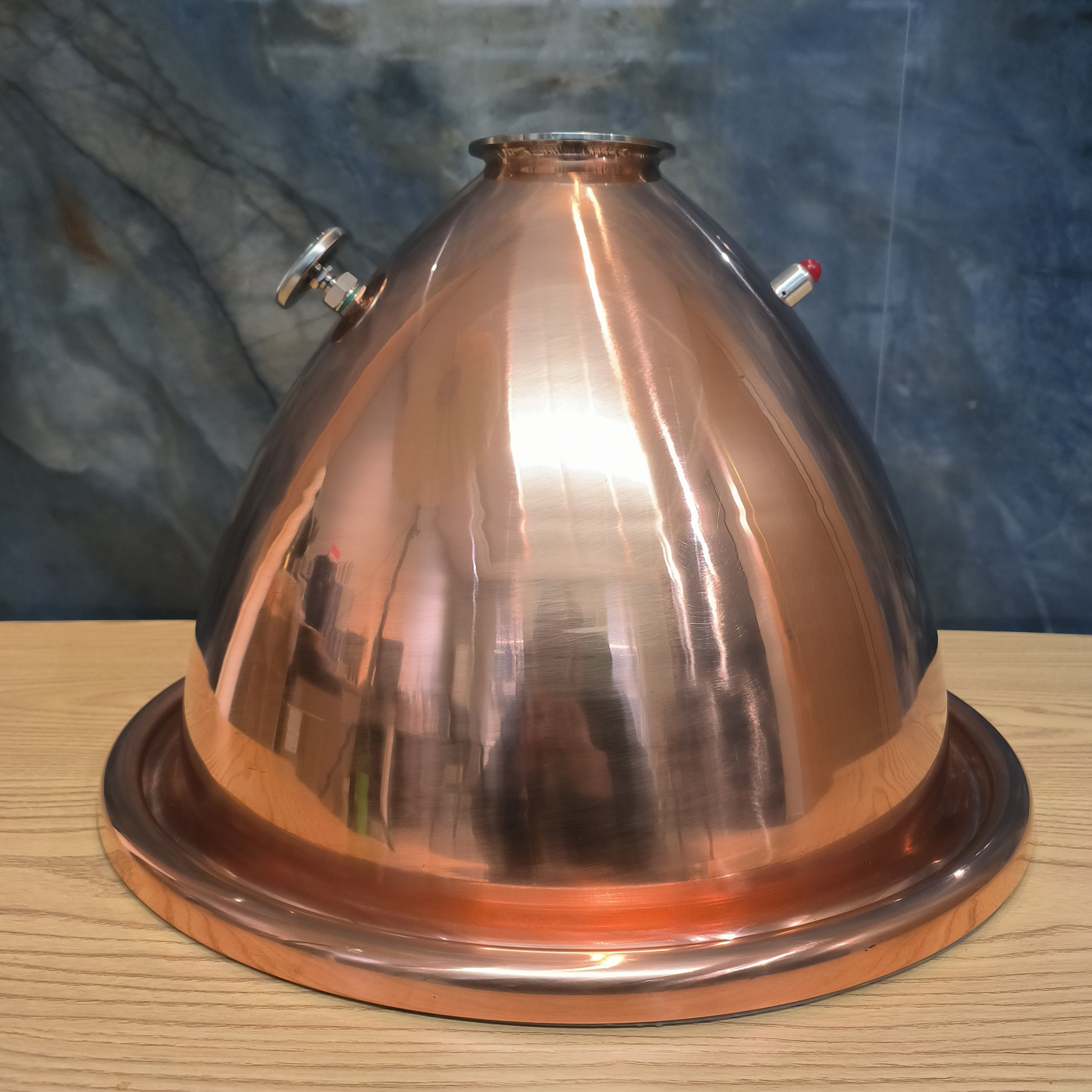 The HOOOLOO Conical Copper Rocket Lid is crafted from 99.95% pure copper, ensuring excellent thermal conductivity and durability for distillation. It features a built-in thermometer with a dual-ring temperature display dial for precise monitoring of the distillation process. Additionally, it includes a safety pressure release valve to ensure secure operation.
