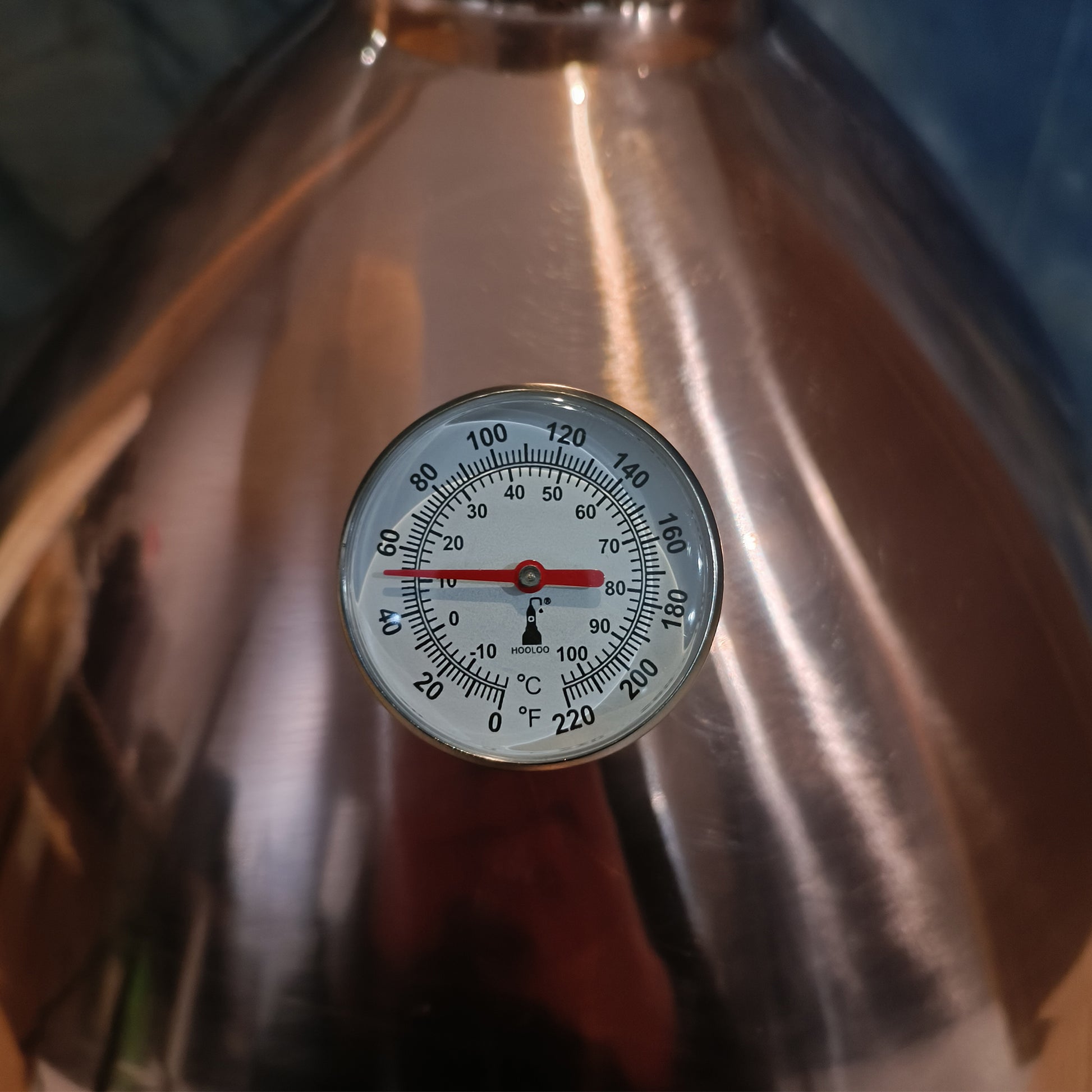 The HOOLOO copper rocket lid is equipped with a dual-ring thermometer and a safety pressure release valve. The thermometer allows precise monitoring of the internal pot temperature, while the pressure release valve ensures safe operation of the distiller under normal atmospheric pressure.