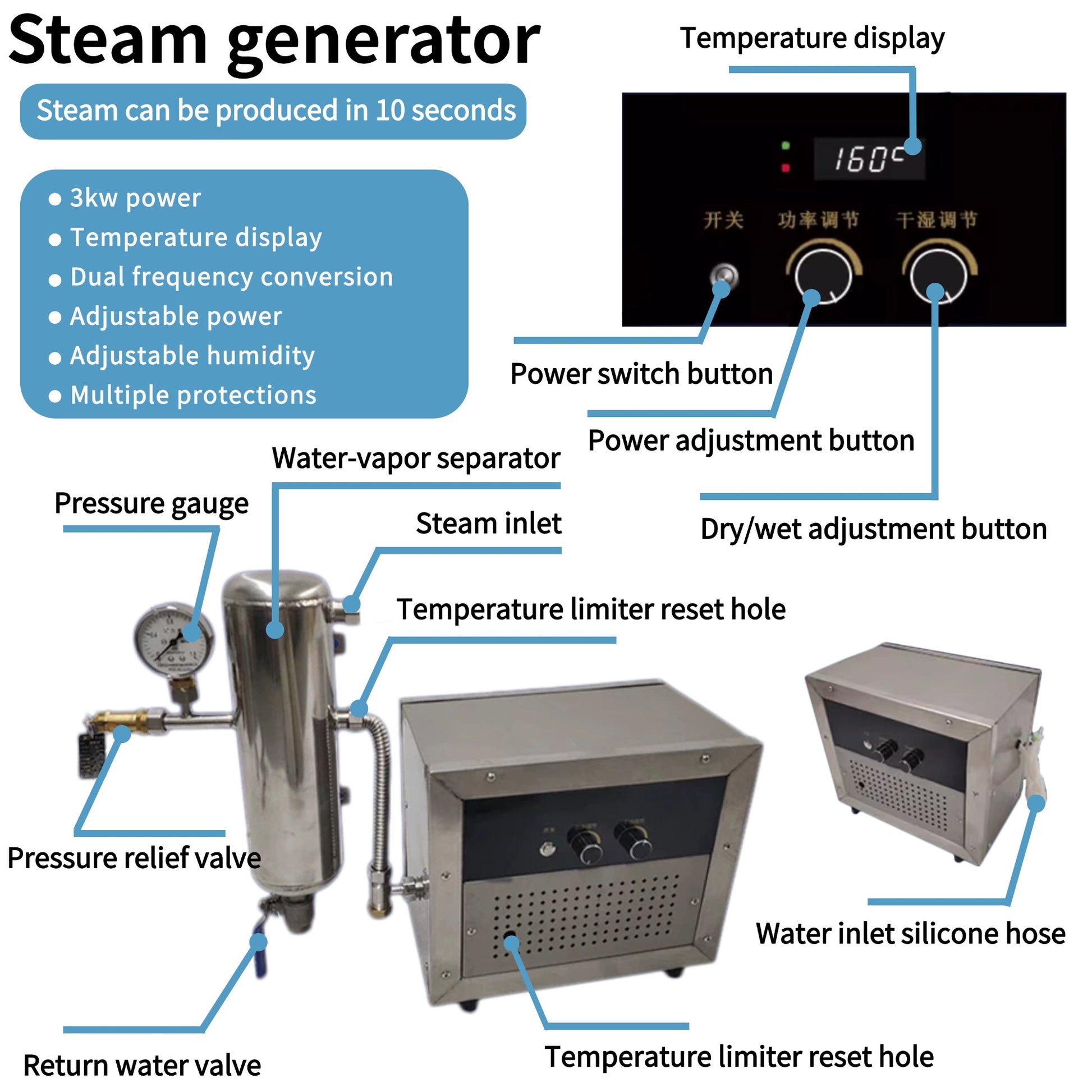 Efficient Heating & Feeding System: Features a 3kW steam generator as the heating source, which can generate steam in 10 seconds to accelerate preheating. Paired with a peristaltic pump, it enables continuous feeding.