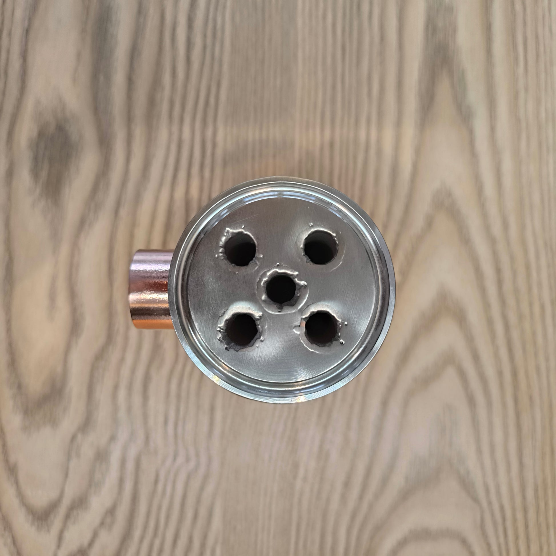 A tubular condenser has at least 3 heat exchange tubes inside, all made of red copper and stainless steel.